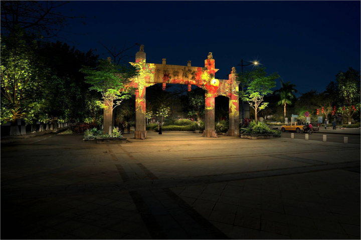 根據(jù)分區(qū)主題,加入能與白天景觀相結(jié)合的燈光元素,在宣傳當(dāng)?shù)乇就撂厣耐瑫r(shí),更能增強(qiáng)照明的趣味性