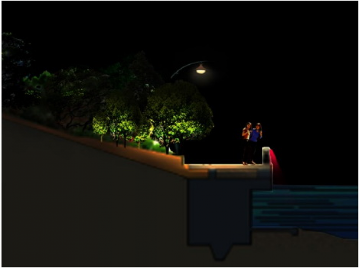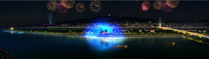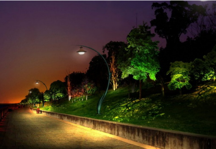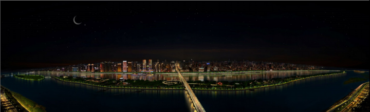 在橘子洲頭毛主席像周邊的水面上利用投影燈,將毛主席詩詞,投放在水面,打造一種唯美的意境。既可以成為一種靚麗的景觀,又符合廣場的主題。在其他節(jié)假日也可以通過修改投影的內(nèi)容,投放其他的元素,對(duì)橘子洲頭的景觀照明做出一個(gè)大的提升。在焰火廣場的的位置安裝“水幕電影”,通過以水幕為畫布,以燈光為畫筆的形式在水幕上訴說著長沙的歷史文化,水幕成為人們了解人文歷史的藝術(shù)媒介,同時(shí)又可通過安裝激光、探照燈再結(jié)合音響,利用聲光電的配合上演水幕激光秀,從而達(dá)到有景可賞的目的。傅家洲目前還沒有任何照明,我們建議傅家洲的照明須與橘子洲的光色亮度統(tǒng)一起來,如此方能形成一個(gè)整體。照明手法表現(xiàn)也是將環(huán)洲的臨江界面綠化打亮,來表現(xiàn)傅家洲的夜景輪廓以及東西兩岸看過來的夜景視覺效果。